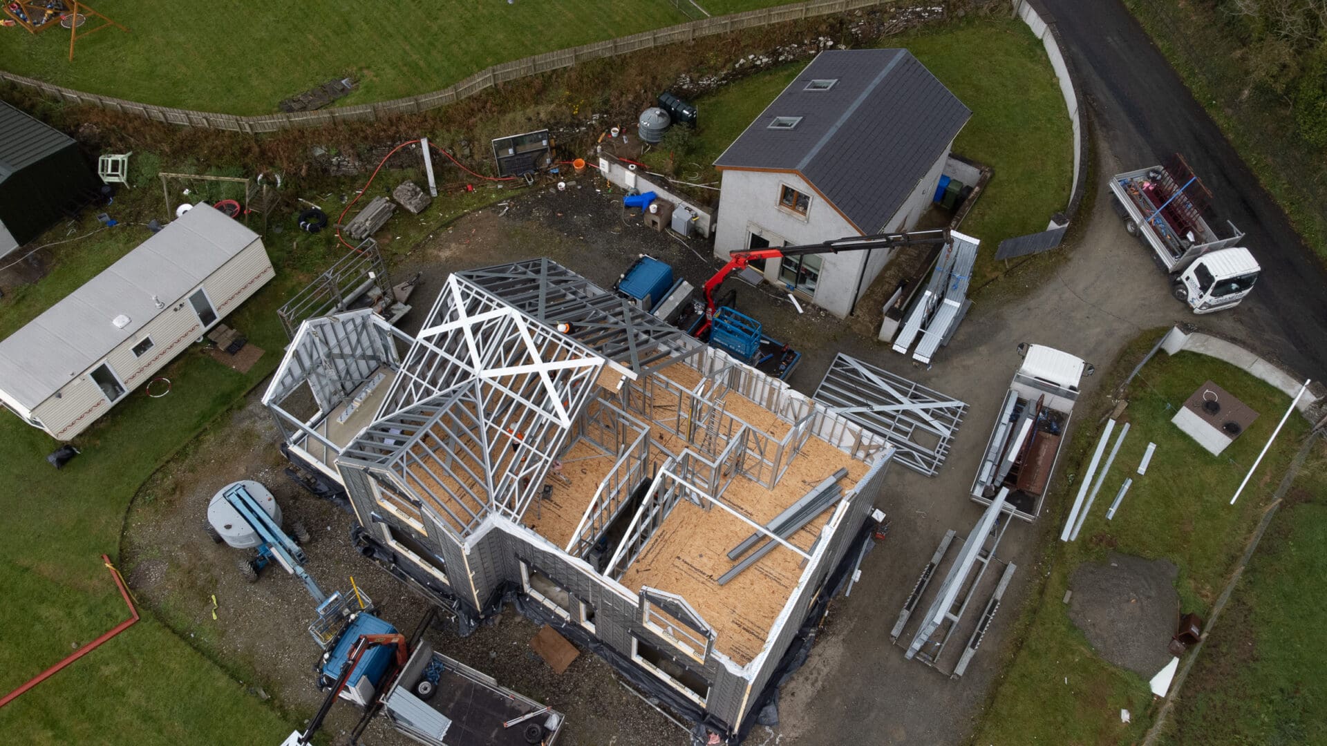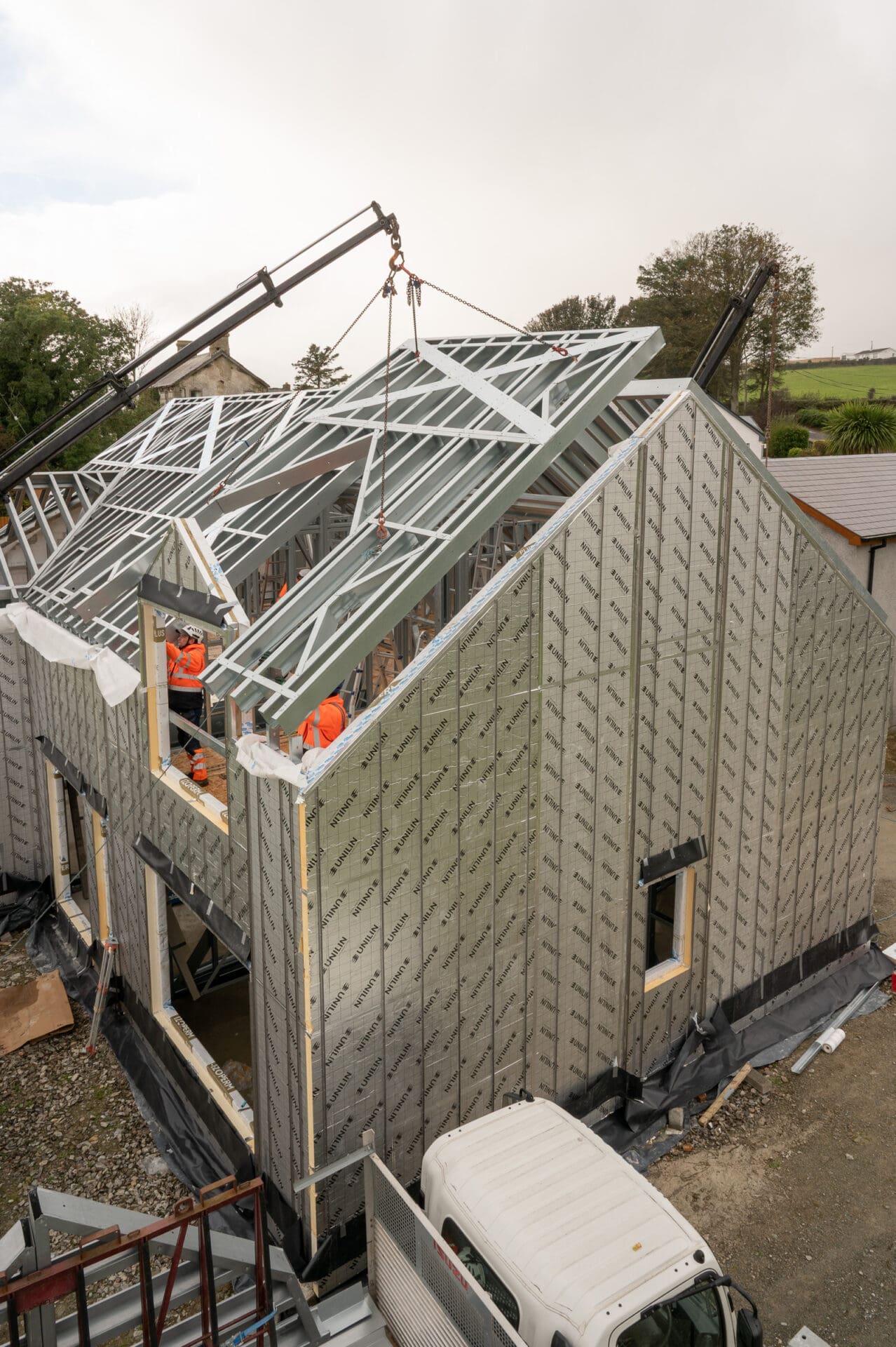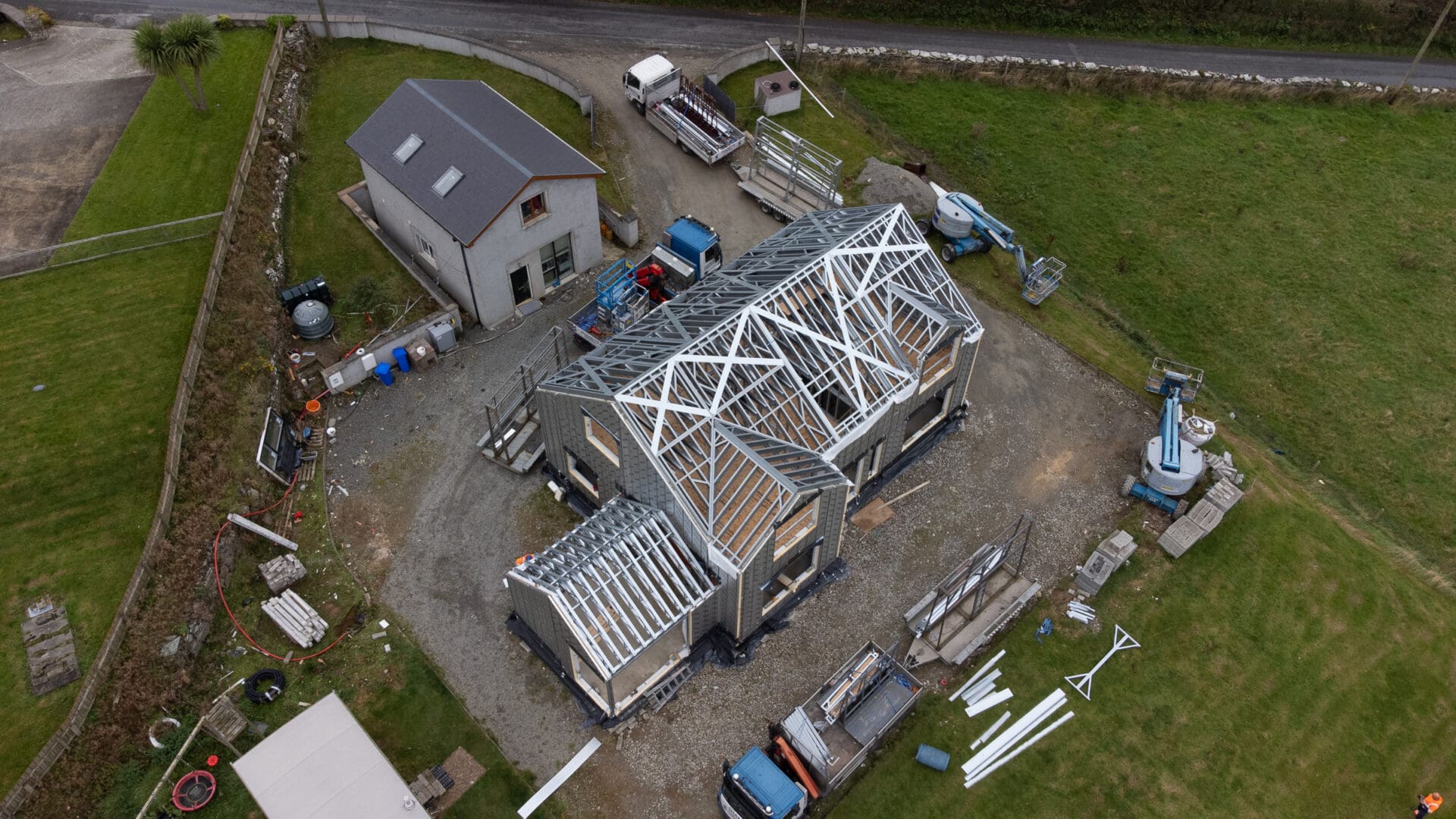 The external walls were constructed using System 1 of our wall build-up options, a hybrid steel frame system incorporating PIR insulation with a masonry outer leaf. This approach combines the structural precision of light gauge steel with the familiarity and durability of traditional blockwork, making it a popular choice for one-off homes across Ireland.