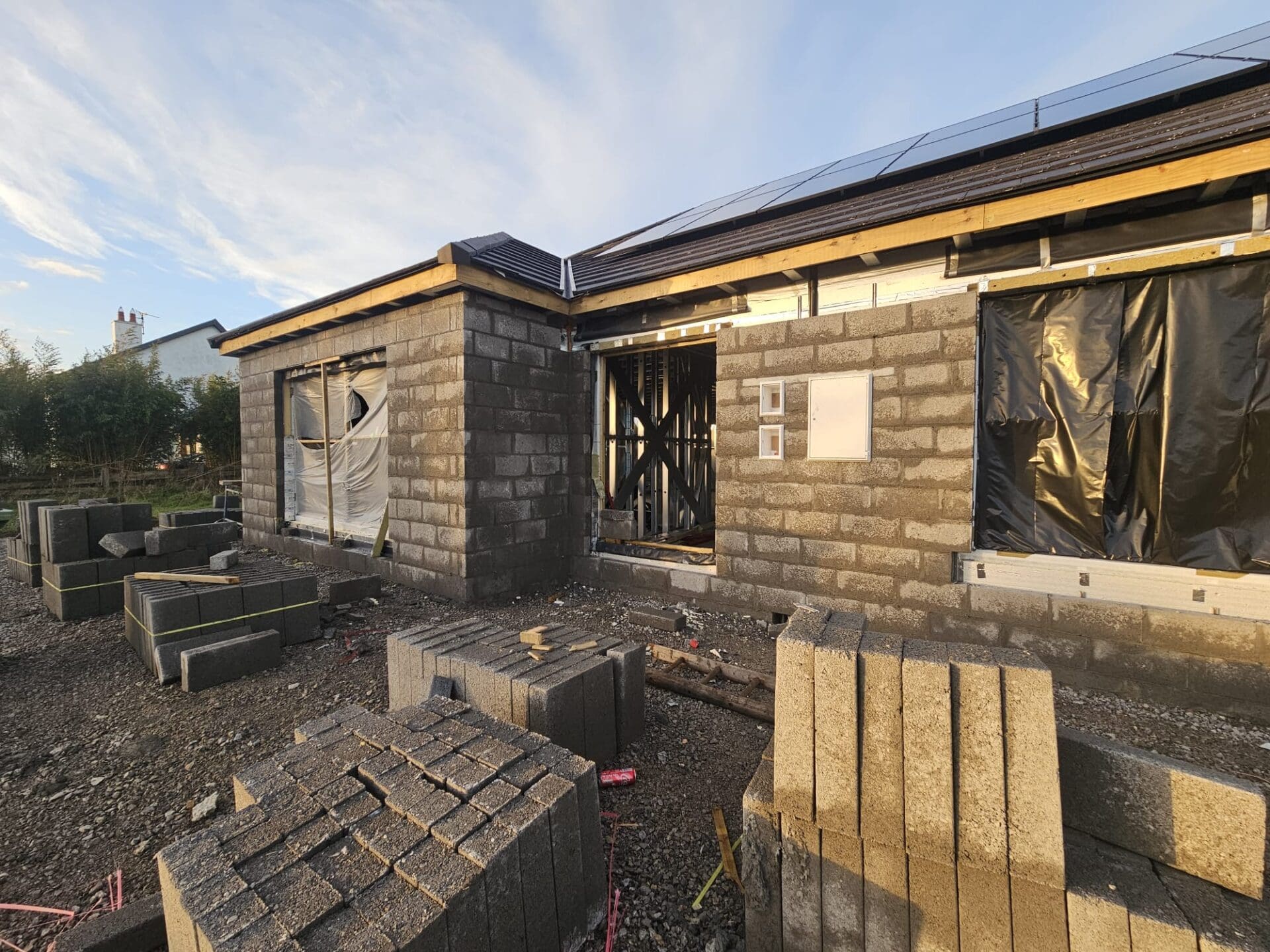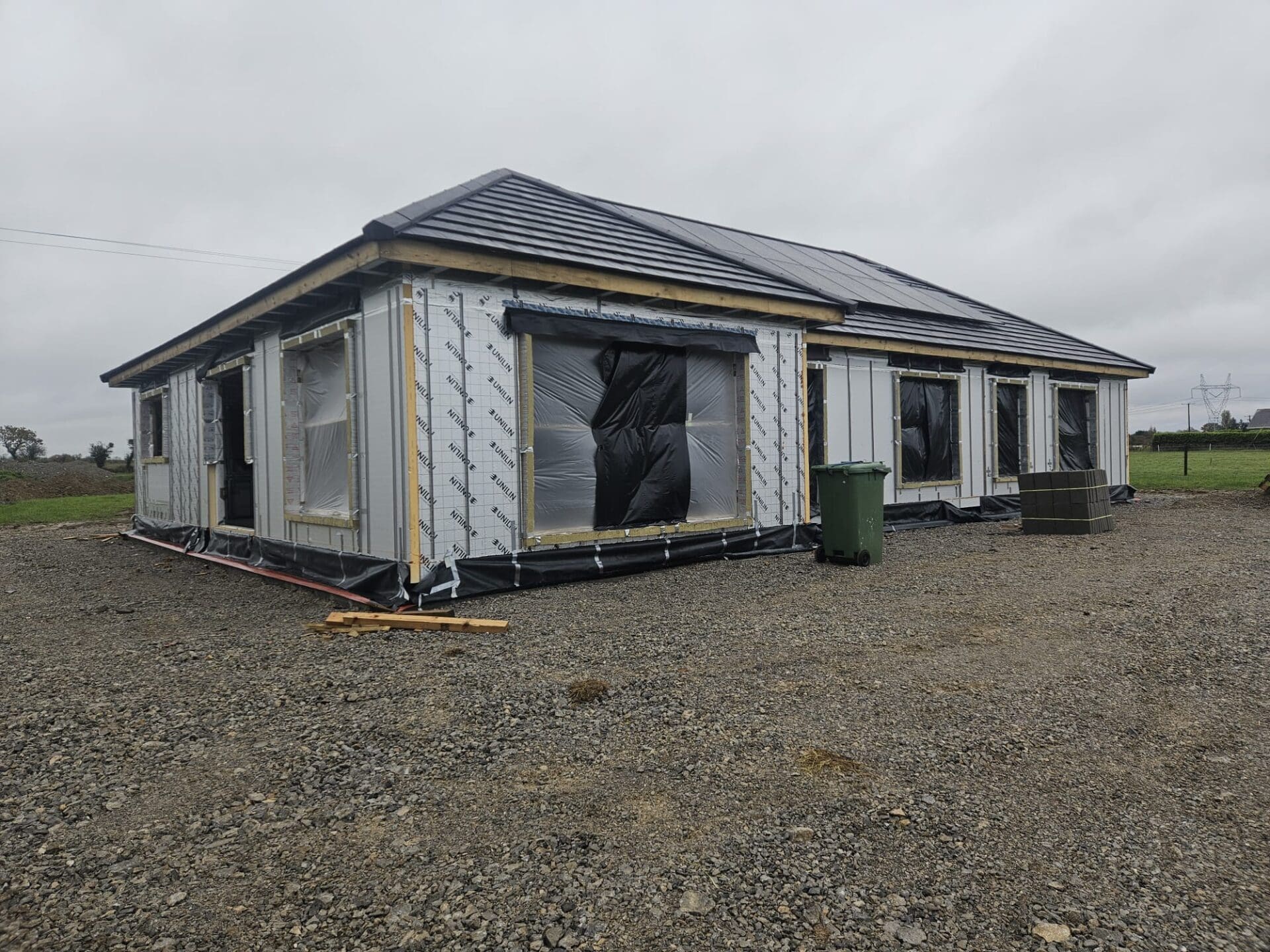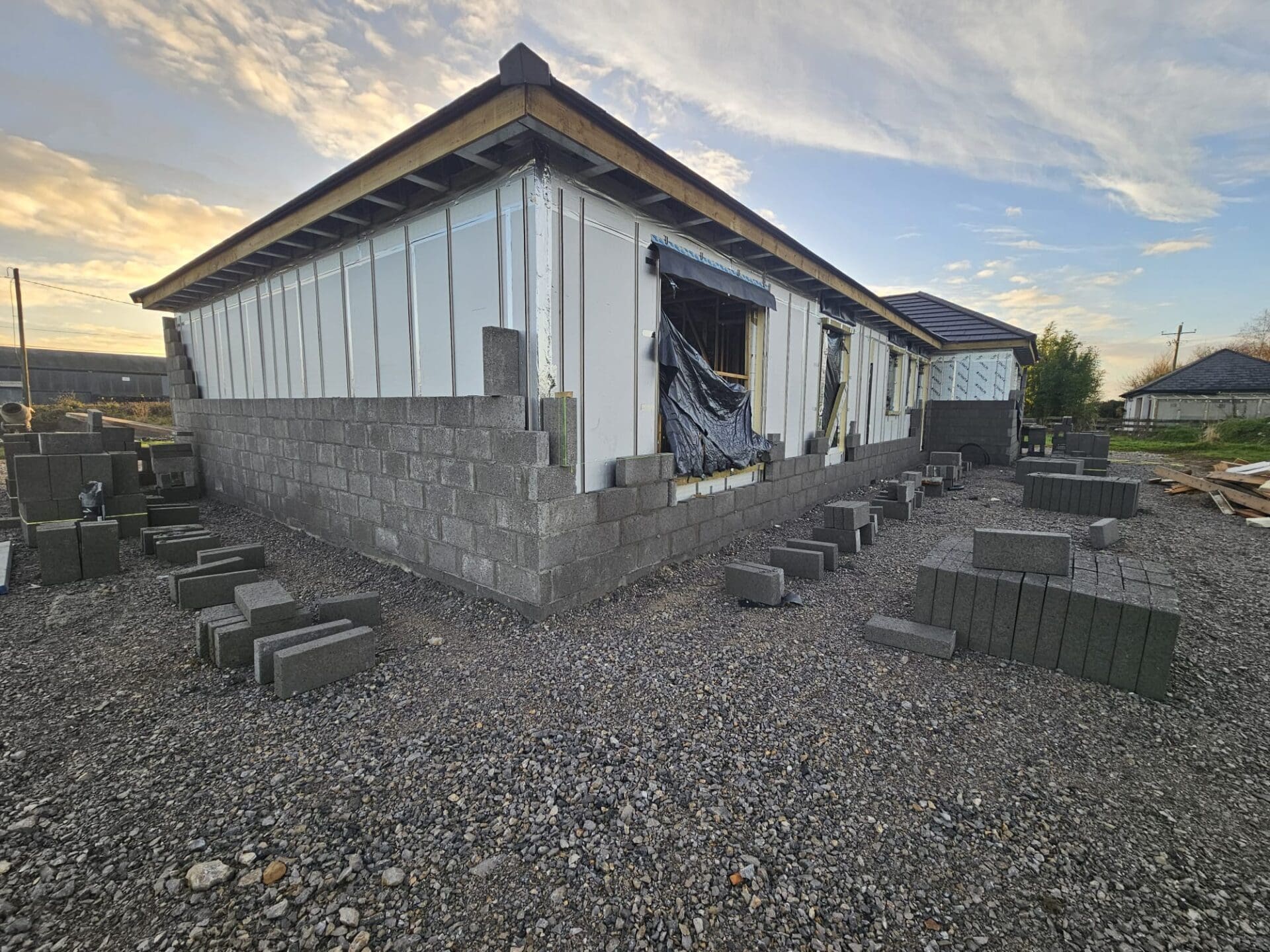 The external walls were constructed using System 1 of our wall build-up options, a hybrid steel frame system combining PIR insulation within the steel frame and a masonry outer leaf. This approach provides excellent thermal performance while allowing the client’s builder to complete traditional blockwork and render externally.